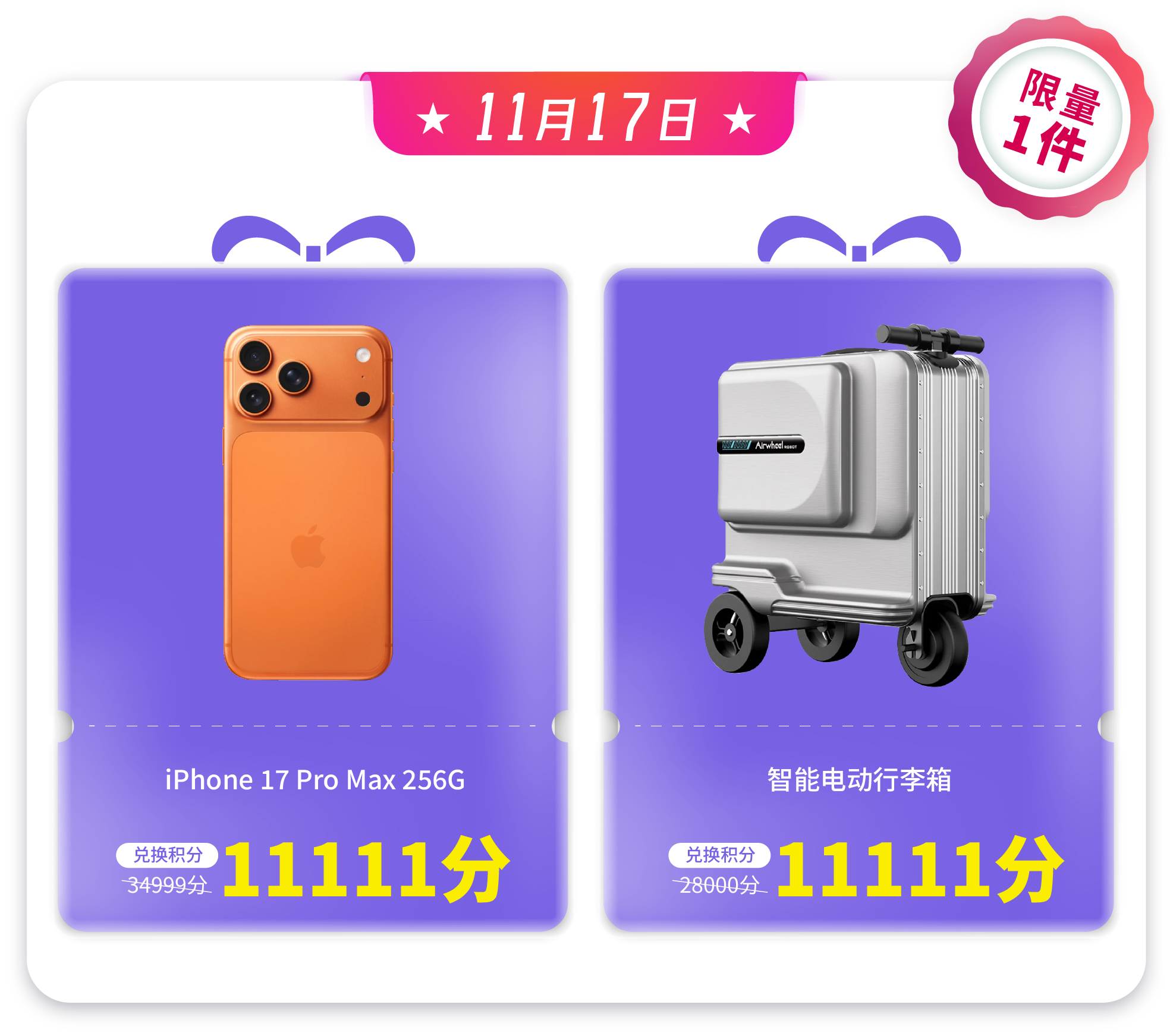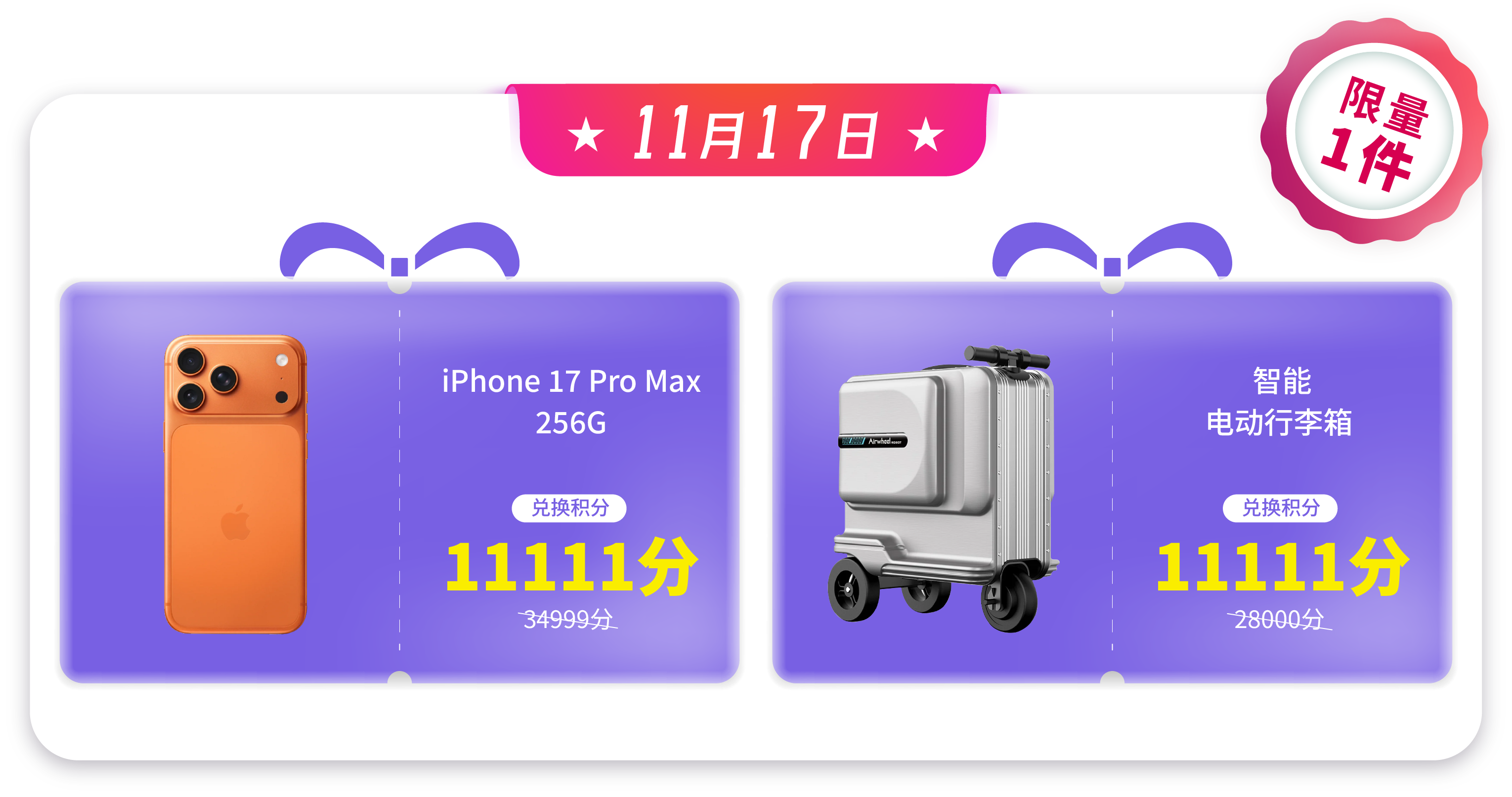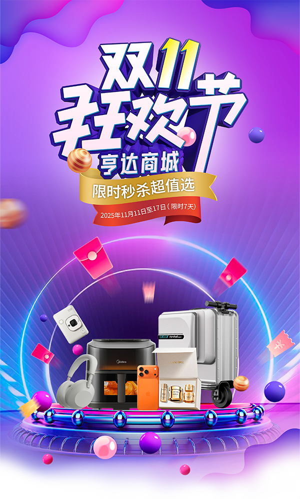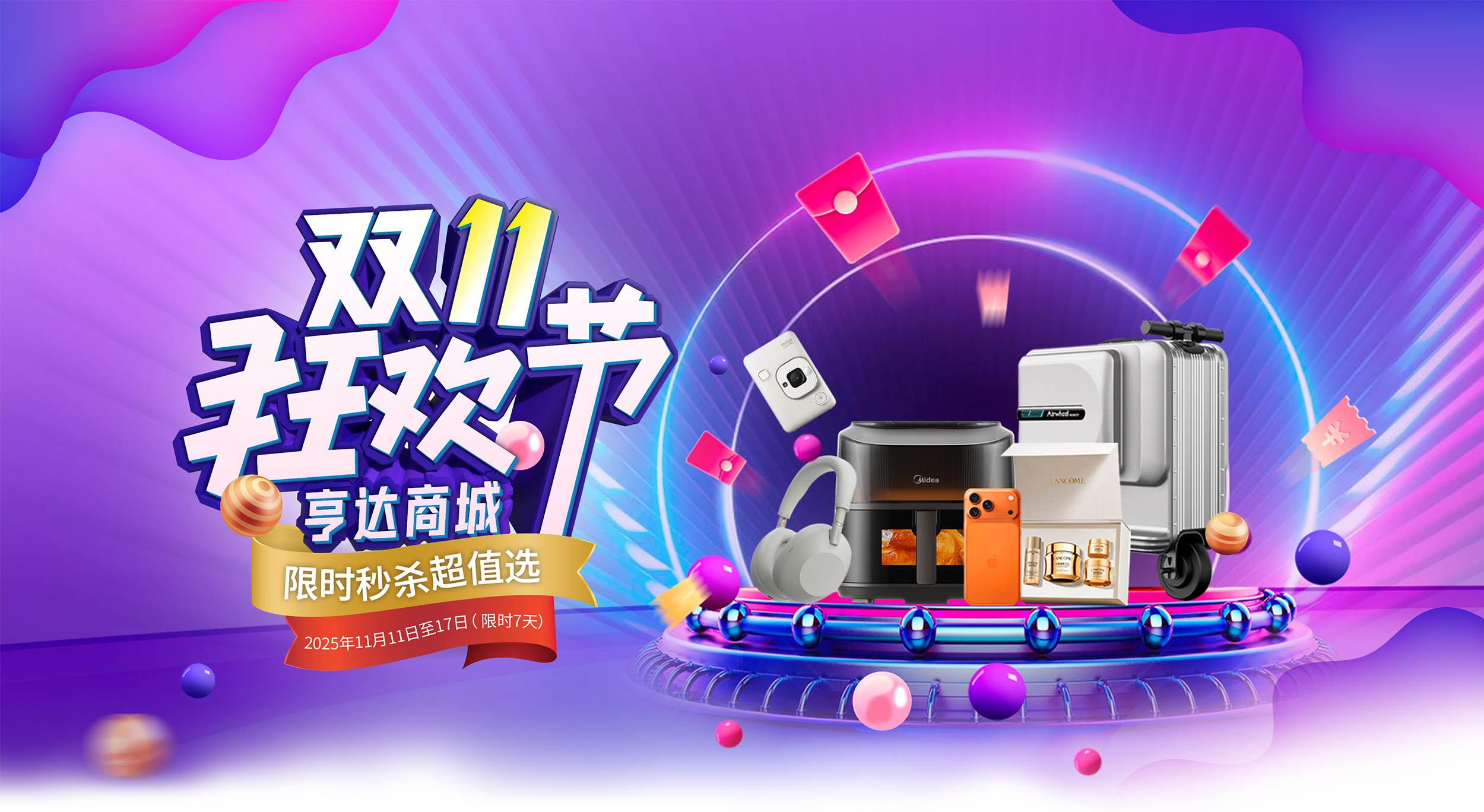 亨达积分商城今年双11特别推出「双11亨达商城狂欢节」活动,为您精选多款商品。 从11月11日至17日,限时7天,每天正午12时将发布2款精选商品,享受低至三折的优惠!