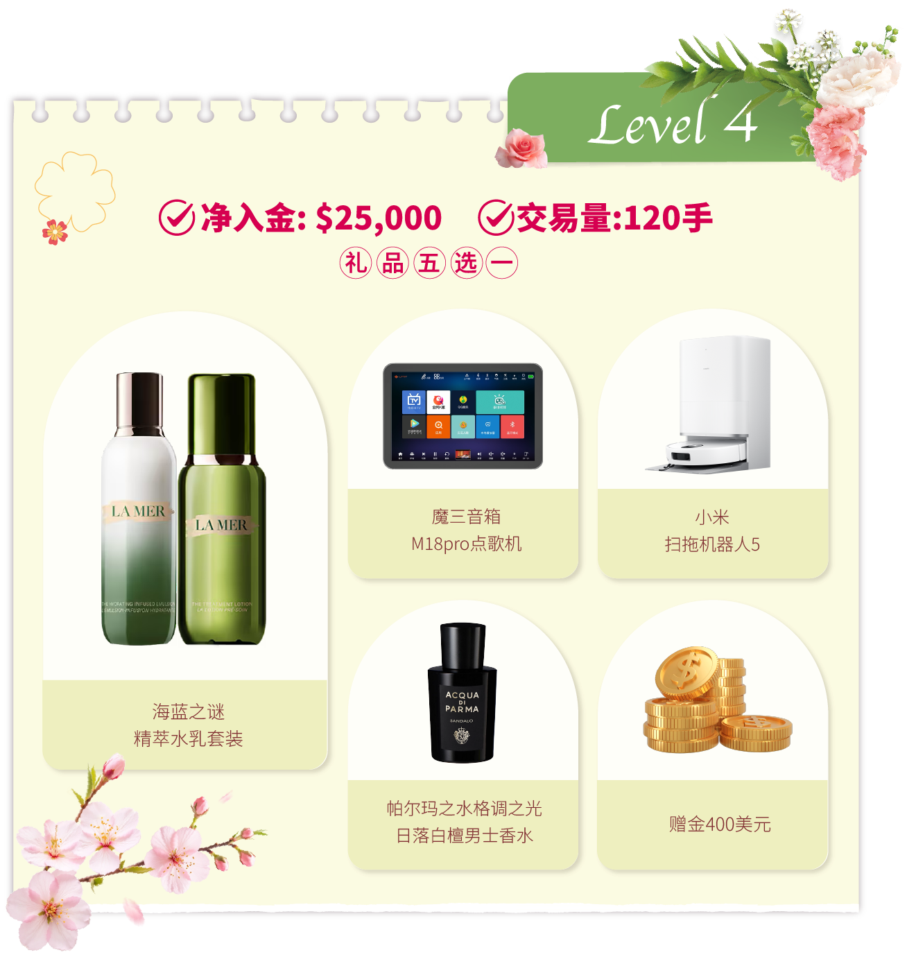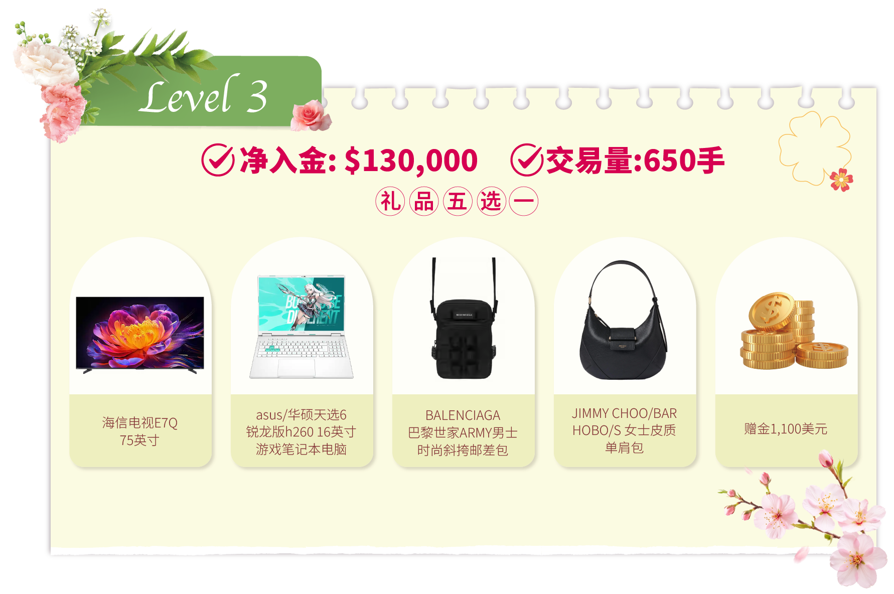 在活动期间内,客户的净入金和平仓手数(美股产品不计算在内)达到相应要求,即可在该层级的五件精选礼品中任选其一。若通过亨达APP完成交易,平仓手数将享有三倍累计计算,助您更快达成目标!